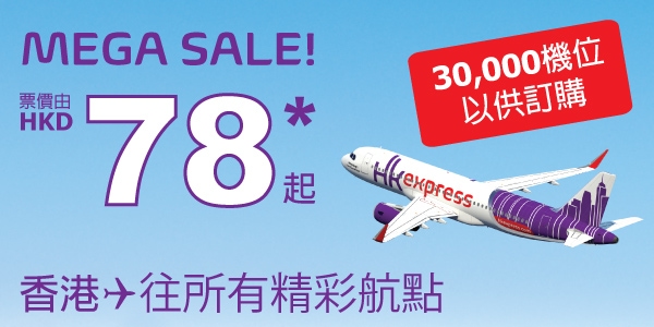 嘩!全線$78!開搶啦!Mega Sale!所有航點單程只需$78 – HK Express (優惠至8月3日)