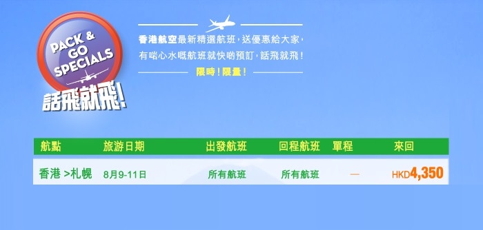 香港航空新一期”話飛就飛”優惠得暑假飛札幌
