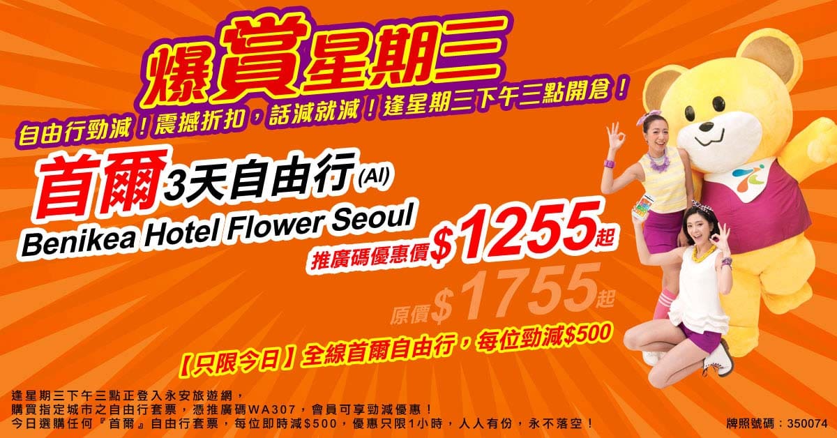 又有抵玩首爾套票!永安旅遊會係下午3點推出限時1小時全線首爾套票每人減$500優惠,不限名額