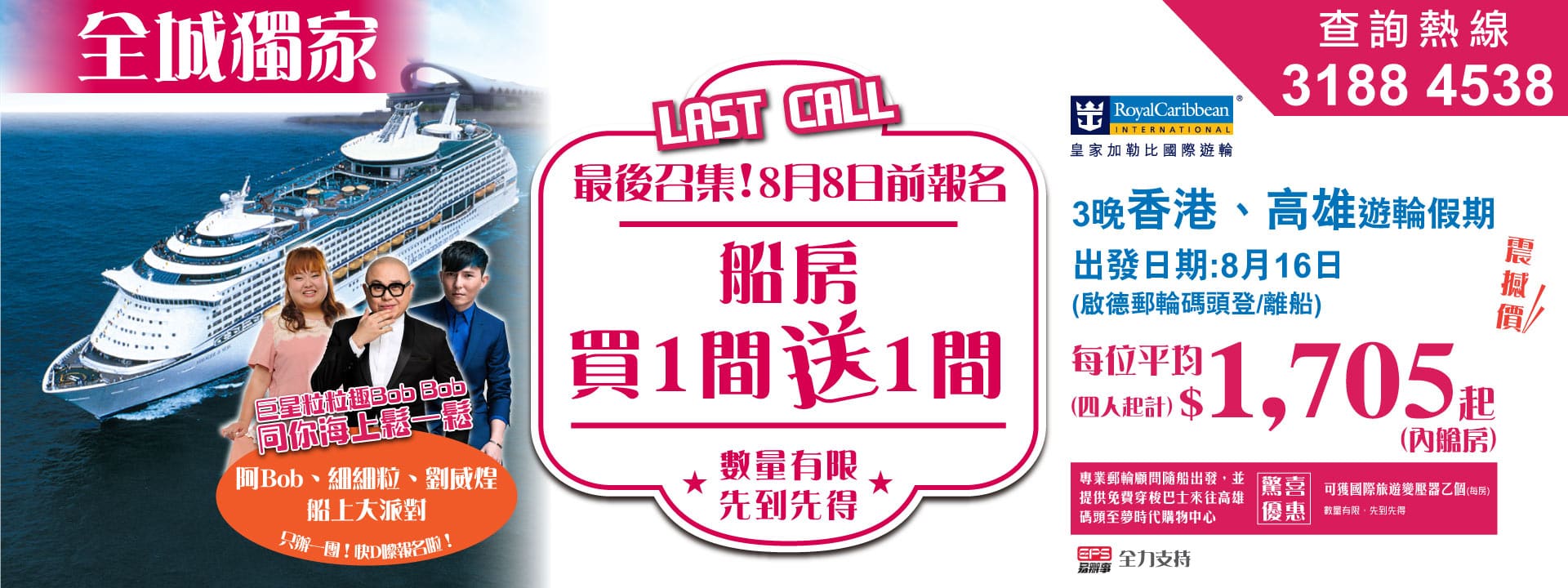 船上仲有專業旅運客人獨家嘅Party,阿Bob、細細粒同劉威煌會係船上同大家玩遊戲開Party,優惠期至8月8日