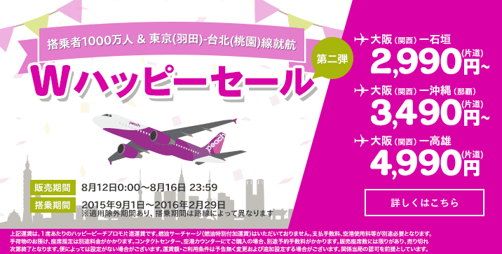 以上價錢並未包括託運行李及機上餐飲既費用,託運行李每程每件20kg以下2,600円