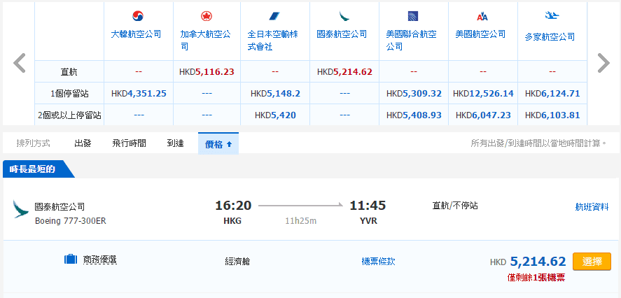 香港往返溫哥華只需$4,393,連稅$5,215;多倫多$5,584,連稅$6,448