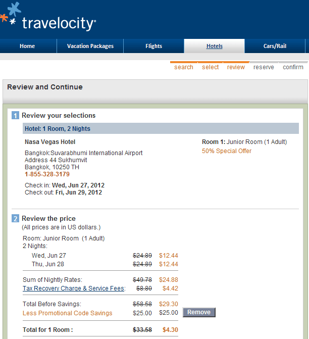 我地以泰國曼谷2晚hotel原本連稅 US$29.3,用左Promotional code 減US$25,只需US$4.3就可以住2晚,即系港幣$34