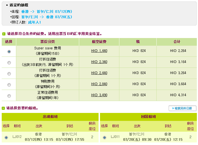 由香港飛首爾仁川 航班編號:LJ012 出發時間:13:15 到達時間:17:55