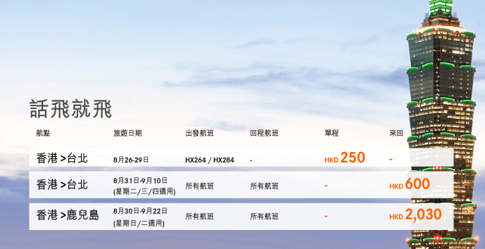 另外8月26日至8月29日香港飛台北單程只需$250,連稅$419,限坐HX264 12:10-13:50 、HX284 22:50-00:40+1
