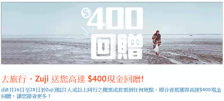 ZUJI 今日推出限時3日機票/套票$100現金回贈優惠