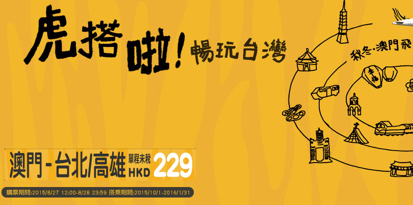 明年1月31日前出發!澳門往返台北、高雄來回連稅只需$838 – 台灣虎航 (優惠至8月28日)