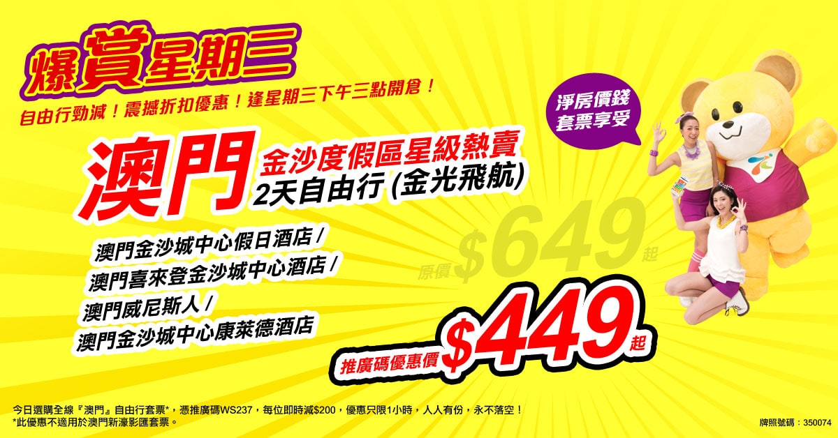 永安旅遊今個禮拜爆賞星期三優惠,下午3點限時1小時澳門套票每人減$200優惠,不限名額