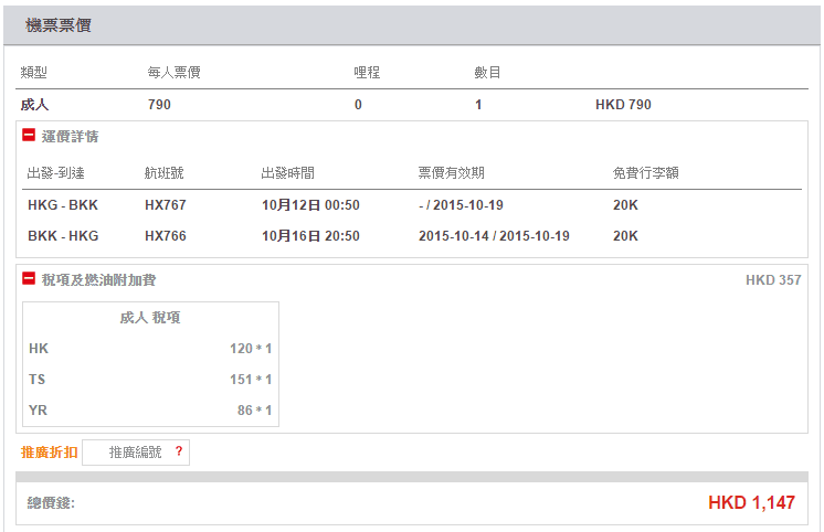 香港往返曼谷只需$790 ,連稅$1,147,價錢幾吸引