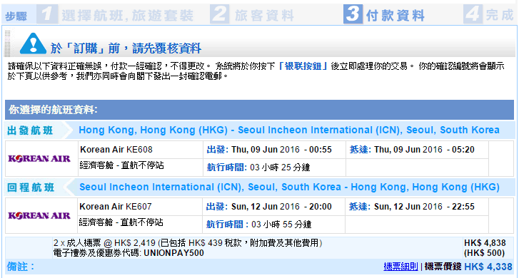 銀聯信用卡付款減$500後,機票連稅$2,169