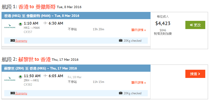 經我們測試,以3月8日曼徹斯特入,3月17日蘇黎世走為例