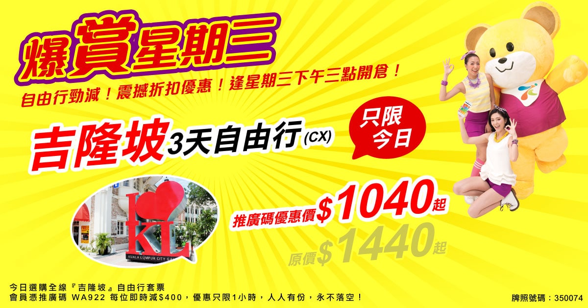 永安旅遊今個星期爆賞星期三優惠,下午3點限時1小時全線吉隆坡套票每人減$400優惠
