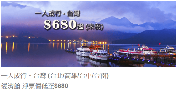 香港往返台北/高雄/台中/台南只需$680,連稅$1,050
