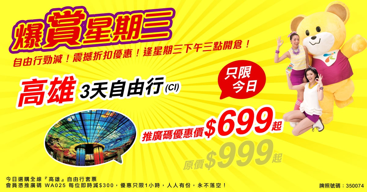 永安旅遊今個星期爆賞星期三優惠,下午3點限時1小時全線高雄套票每人減$300優惠