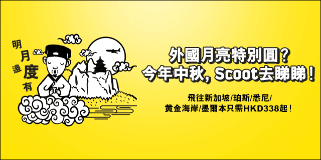 http://www.flyscoot.com (FlyBag/ FlyBagEat/ ScootBiz減$50促銷代碼:MOONCAKE )