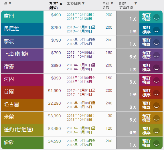 (廈門$490 連稅$768)、(馬尼拉$790 連稅$1,050)、(寧波$790 連稅$1,068)、(上海$790 連稅$1,068)、(宿霧$890 連稅$1,058)、(河內$990 連稅$1,364)、(首爾$1,990 連稅$2,341)、(名古屋$2,290 連稅$2,624)、(米蘭$3,390 連稅$3,978)、(紐約$3,490 連稅$4,318)、(倫敦$4,590 連稅$6,254)