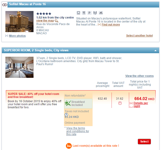 抵呀!雅高Accor酒店集團全球酒店六折優惠,再送早餐!澳門十六浦索菲特酒店包早餐連稅$664起 (優惠至10月16日)