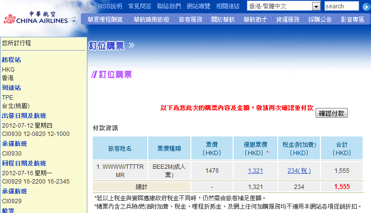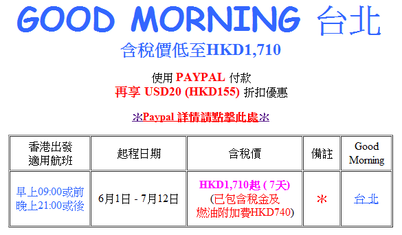 香港往返台北只需 $970, 配合 PayPal 網路購票優惠減 $155,即係機票只需 $815,連埋稅 $1,555