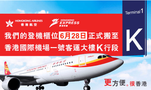 由2011年6月28日起, 香港航空辦理登機手續櫃枱將遷到香港國際機場一號客運大樓K段。