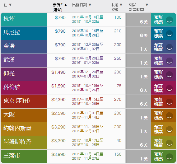 而杭州、馬尼拉、科倫坡、東京羽田、阿姆斯特丹係介乎10月15日至10月26日指定日子來回