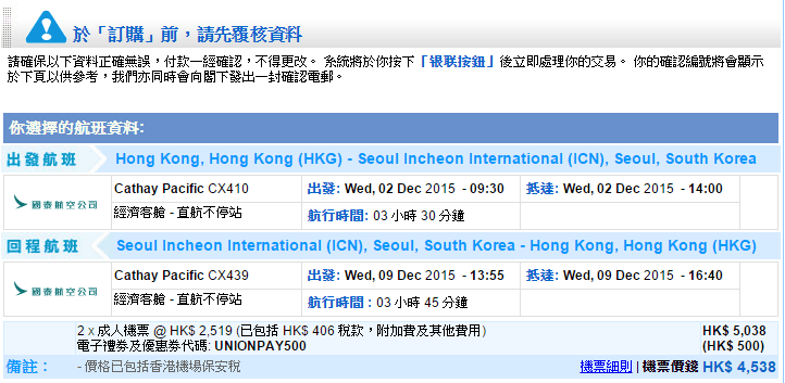 https://www.cathaypacific.com ($2,220,連稅首爾$2,576,釜山/濟州$2,542)