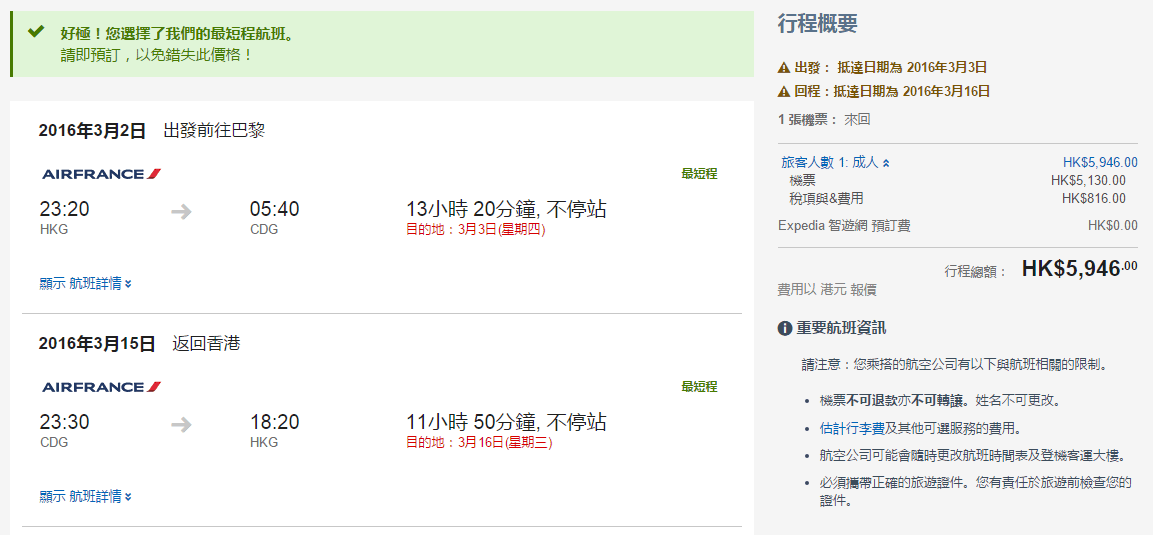 只需$5,130 + $816 (稅) = 機票連稅$5,946