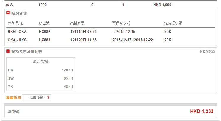 沖繩11月出發貴$100,11月限星期一、二、四、日出發,12月限星期日至五出發,回程坐HX681 11:55-13:50,加$300可以揀HX657 16:05-17:50