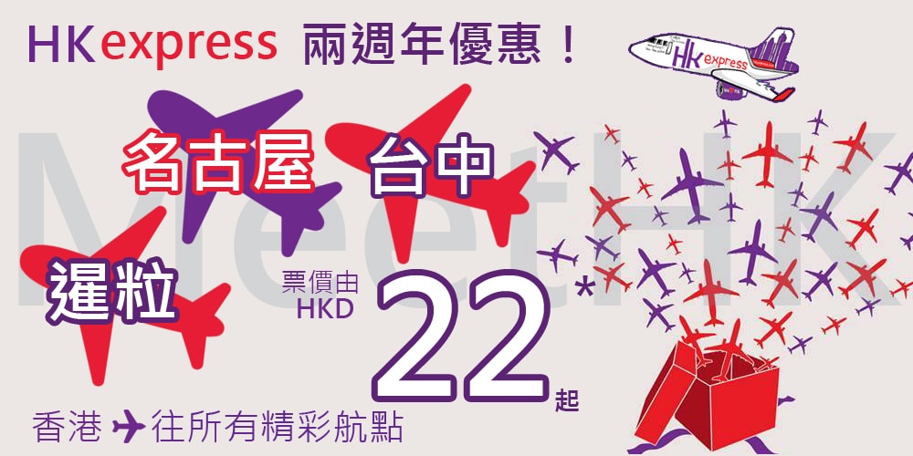 嘩!開搶啦!2周年第四擊$22飛台中、名古屋、暹粒 – HK Express (優惠至10月21日)