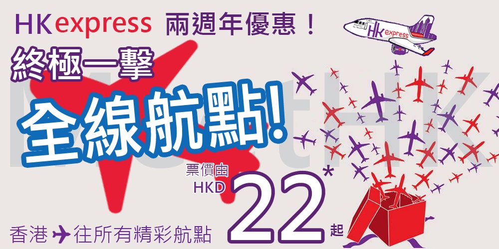 嘩!終極一擊!開搶啦!2周年全線航點單程只需$22 – HK Express (優惠至10月27日)