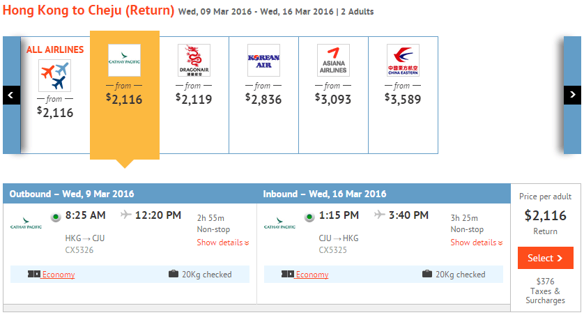 http://www.zuji.com.hk (連稅首爾$2,526、釜山/濟州$2,492)