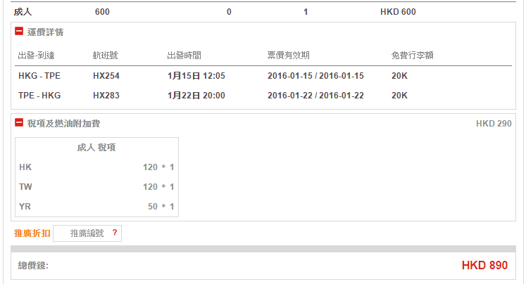 機票只需$600+ $290 (稅) = 機票連稅$890