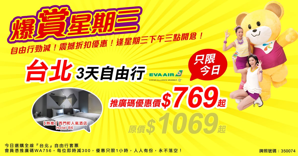 長榮台北3日2夜套票只需$769起,連稅$1,149起,平過分開咁Book!