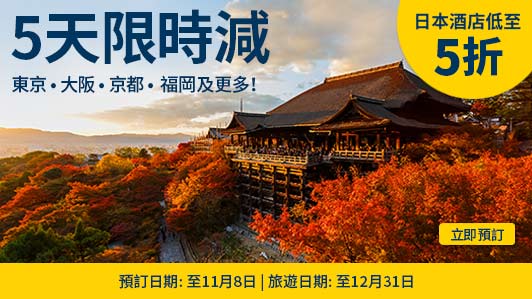 日本酒店限時5天低至五折優惠– Expedia HK (優惠至11月8日)