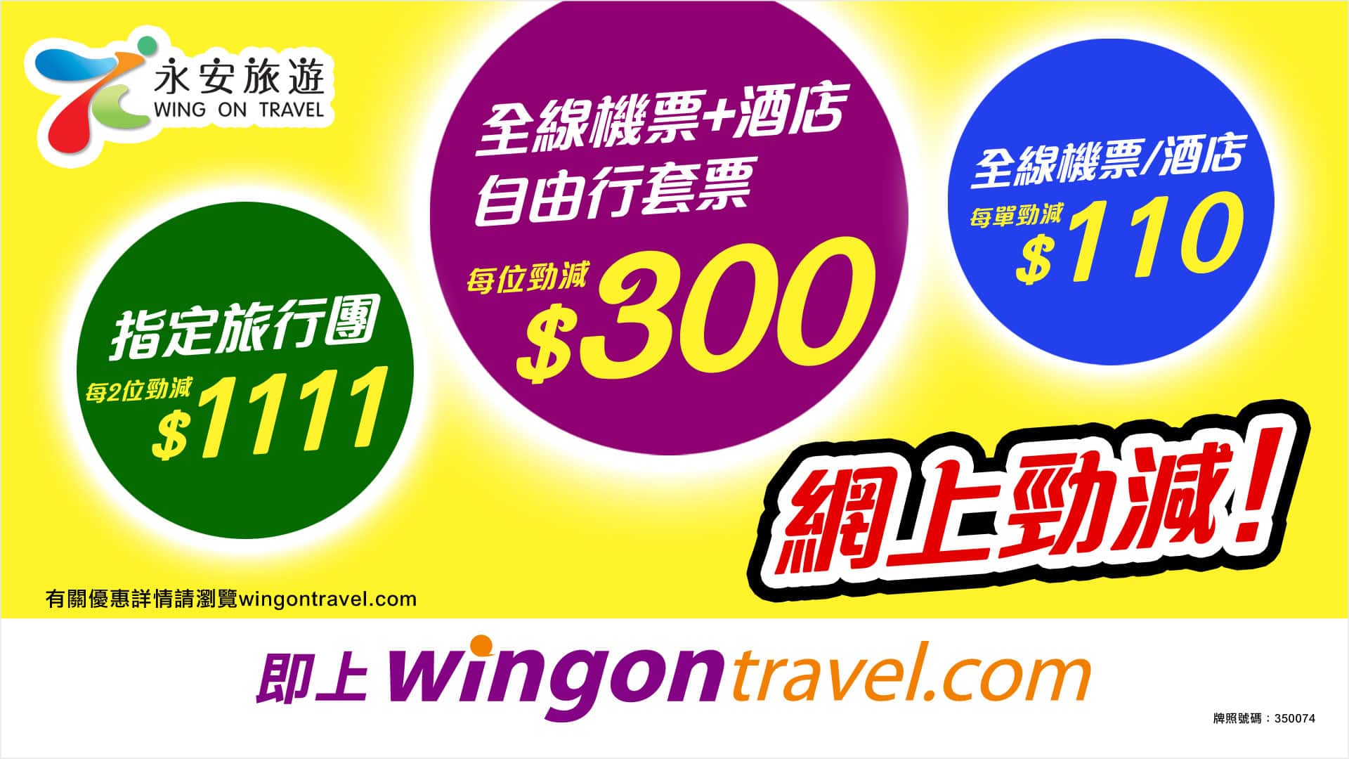 超級爆賞星期三!全線機票+酒店自由行套票每位減$300;全線機票/酒店/澳門珠海套票滿$1,100減$110 – 永安旅遊 (優惠至11月11日11pm)