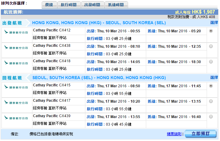 航班選擇都幾多下,不過去程唔可以揀CX410 09:30-14:00,回程唔可以揀CX419 19:50-22:45