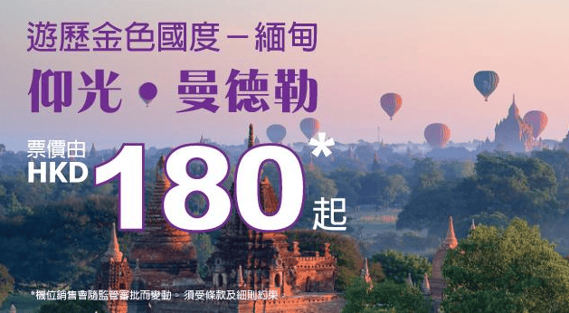 香港飛飛緬甸仰光、曼德勒單程只需$180,來回連稅$721