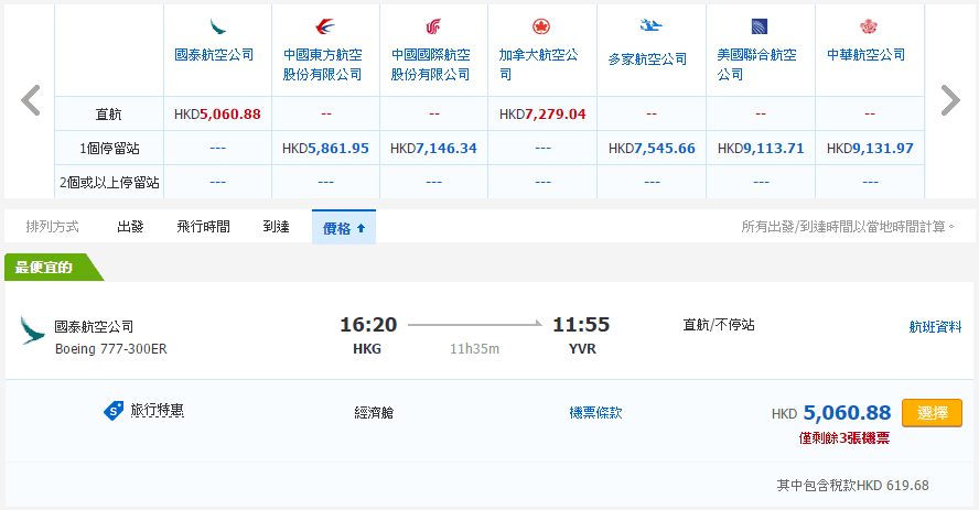 香港直航往返溫哥華只需$4,441,連稅$5,061;多倫多$5,458,連稅$6,120