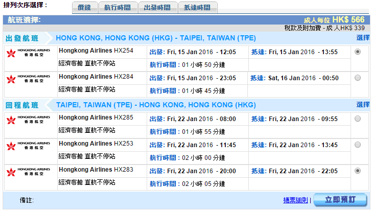 台北$566去程坐HX254 12:05-13:55、HX284 23:05-00:50+1,加$117可以揀其他航班