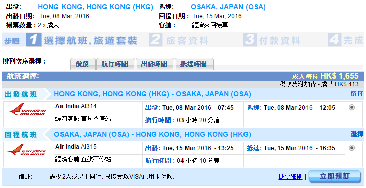 早機出發!香港往返大阪二人同行每人只需$1,655 – 印度航空 (優惠至11月27日)