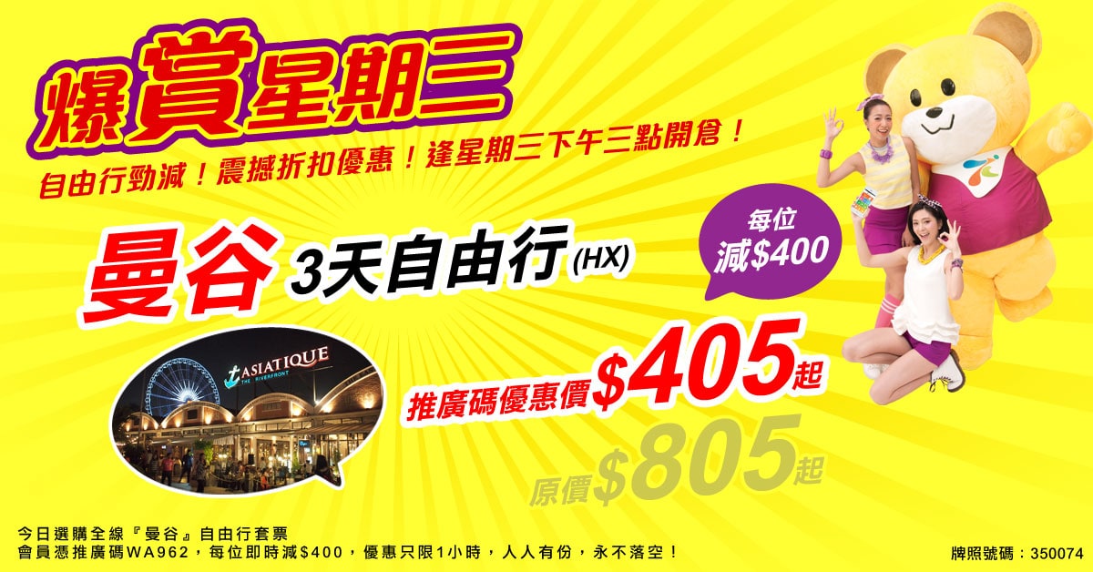 永安旅遊會係明天(11月25日)下午3點推出限時1小時全線曼谷套票每人減$400優惠,不限名額
