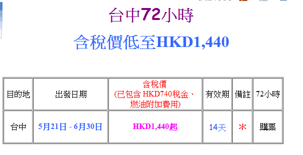 台中機票優惠真係一不離二、二不離三,先有港龍上星期四既飛!撲!精選!(優惠已於19/5完結),再有我地星期六介紹既港航台中$650(優惠至22/5)