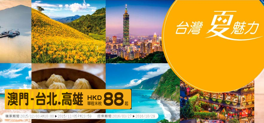 澳門往返台北、高雄單程只需$88,來回連稅同付款手續費$546,價錢好抵!