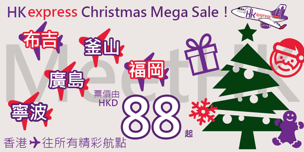開搶啦!聖誕Mega Sale!第二擊$88飛福岡、廣島、釜山、布吉、寧波 – HK Express (優惠至12月11日)