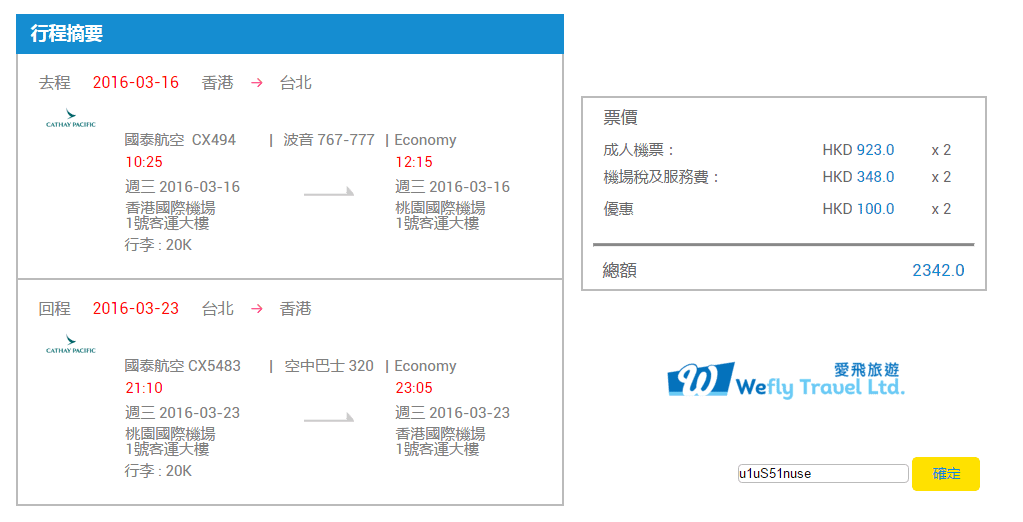 http://www.wefly.com.hk (留意如果係二人同行優惠記住人數要揀2人或以上先見到個優惠)