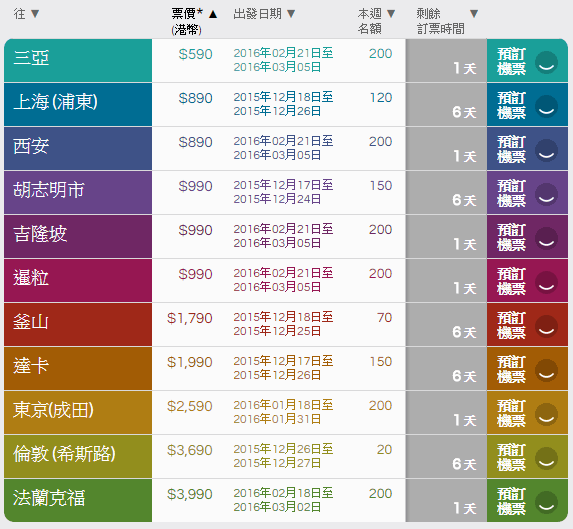 (三亞$590 連稅$819)、(上海$890 連稅$1,119)、(西安$890 連稅$1,119)、(吉隆坡$990 連稅$1,237)、(暹粒$990 連稅$1,304)、(胡志明市$990 連稅$1,277)、(釜山$1,790 連稅$2,061)、(達卡$1,990 連稅$2,677)、(東京$2,590 連稅$2,876)、(倫敦$3,690 連稅$4,838)、(法蘭克福$3,990 連稅$4,822)
