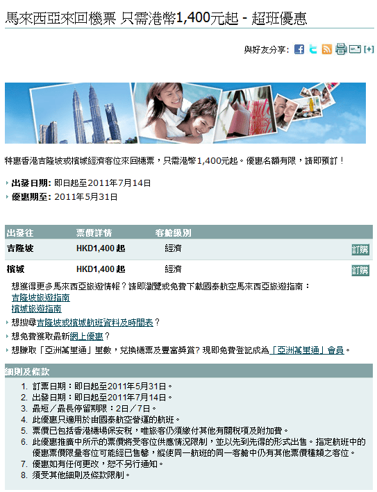 特惠香港吉隆坡或檳城經濟客位來回機票,只需港幣1,400元起。優惠名額有限,請即預訂!