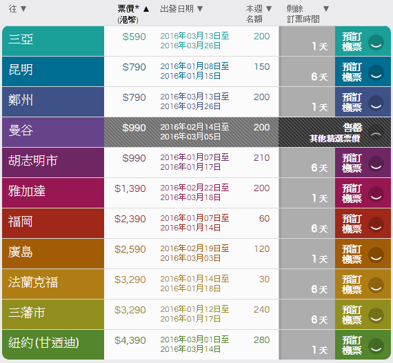 (三亞$590 連稅$866)、(鄭州$790 連稅$1,066)、(昆明$790 連稅$1,066)、(曼谷$990 連稅$1,325)、(胡志明市$990 連稅$1,325)、(雅加達$1,390 連稅$1,644)、(福岡$2,390 連稅$2,621)、(廣島$2,590 連稅$2,758)、(法蘭克福$3,290 連稅$4,331)、(三藩市$3,290 連稅$4,112)、(紐約甘迺迪$4,390 連稅$5,212)