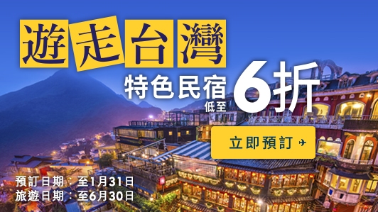 6月30日前入住!台灣特色民宿低至6折優惠 – Expedia HK (優惠至1月31日)