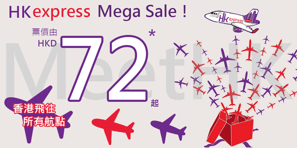 嘩!全線$72!開搶啦!Mega Sale!所有航點單程只需$72 – HK Express (優惠至1月14日)