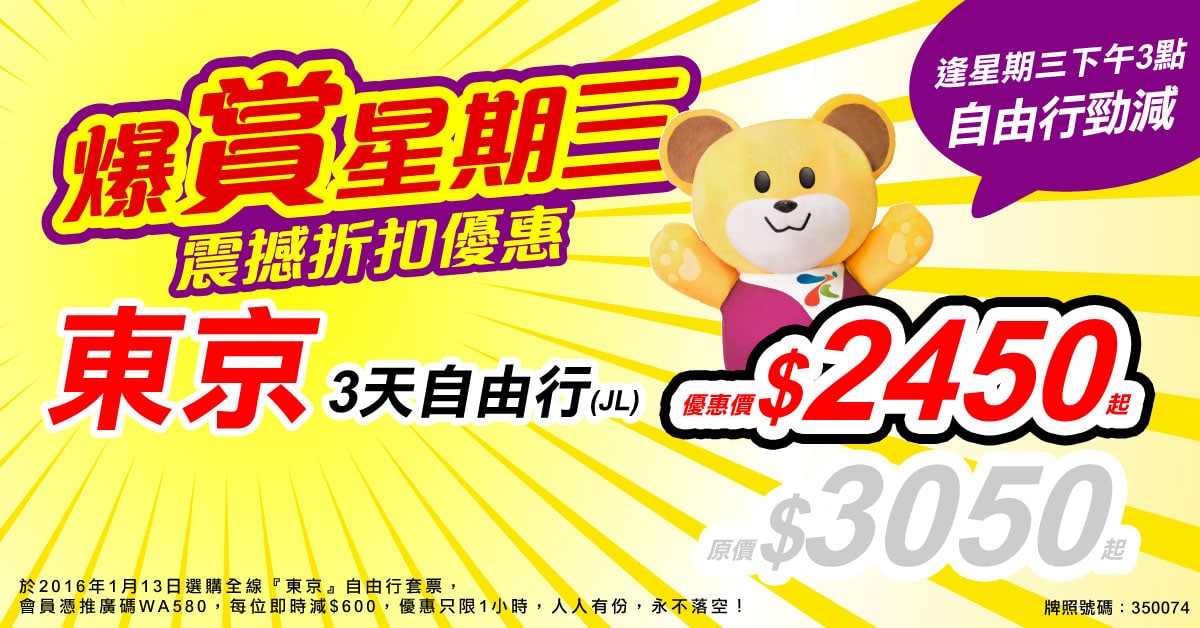 全線東京套票每位減$600推廣碼:WA580